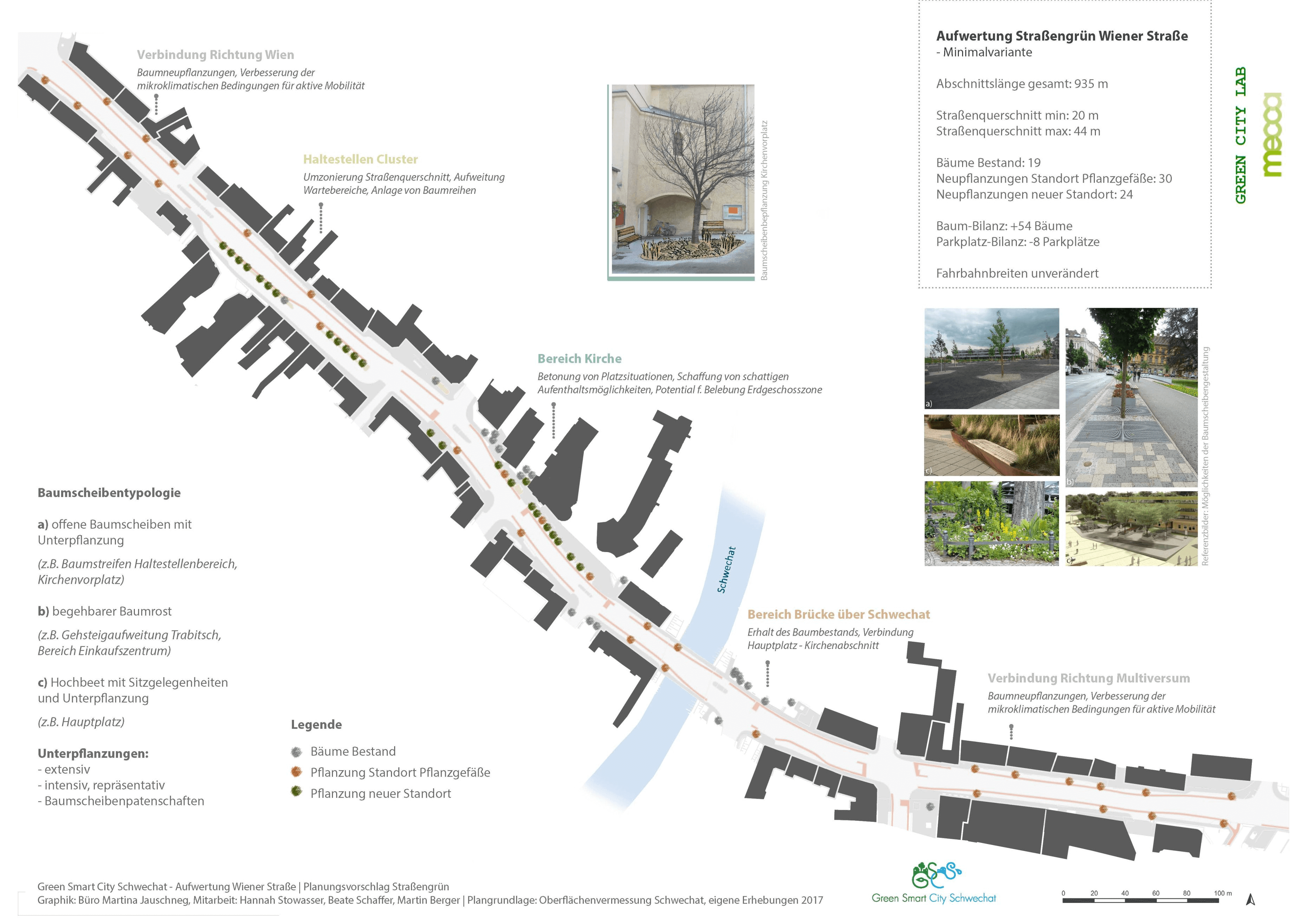 Im Projekt „Green Smart City Schwechat“ wird angestrebt, in einem top-down und bottom-up-Beteiligungsprozess auf Basis eines stadtweiten Klima-Checks der grünen Infrastruktur Ideen, Maßnahmen, Produkte und Praktiken zu sammeln, diese umfassend zu charakterisieren und hinsichtlich ihrer Relevanz für das Stadtklima, ihrer Realisierbarkeit einzuschätzen und in Folge klimawirksame grün-smarte Demoprojekte auf allen Ebenen der Planung zu konzipieren. Eine Umsetzungsstrategie (Roadmap) ebnet damit den Weg zur Realisierung der Green Smart City Schwechat.