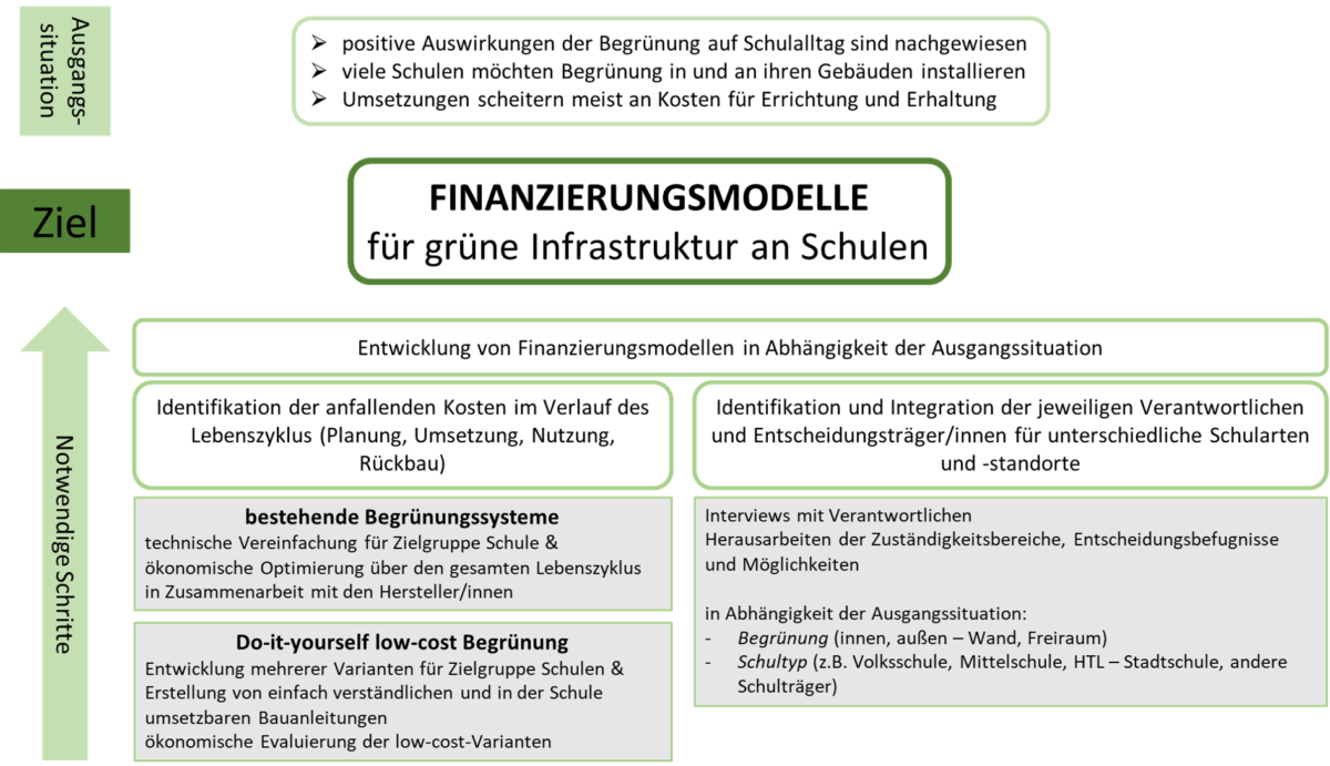Despite many known positive effects of green infrastructure in schools, these have not been implemented or have been implemented only to a limited extent. The reason for this is the lack of financing possibilities. Therefore, financing models are being developed for the first time within the framework of the MehrGrüneSchulen project. For this purpose, the responsible decision-makers throughout Austria will be identified and integrated into the development depending on the type of school, the location and the type of greenery. As a basis/input for this, the life-cycle costs of existing and optimised greening systems will be identified and processed and, in addition, easily implementable solutions for green infrastructure will be developed for independent implementation in schools and realised in an exemplary manner in at least one school per federal province. The developed financing models provide a broad argumentation and action basis for the roll-out of green infrastructure at schools throughout Austria.